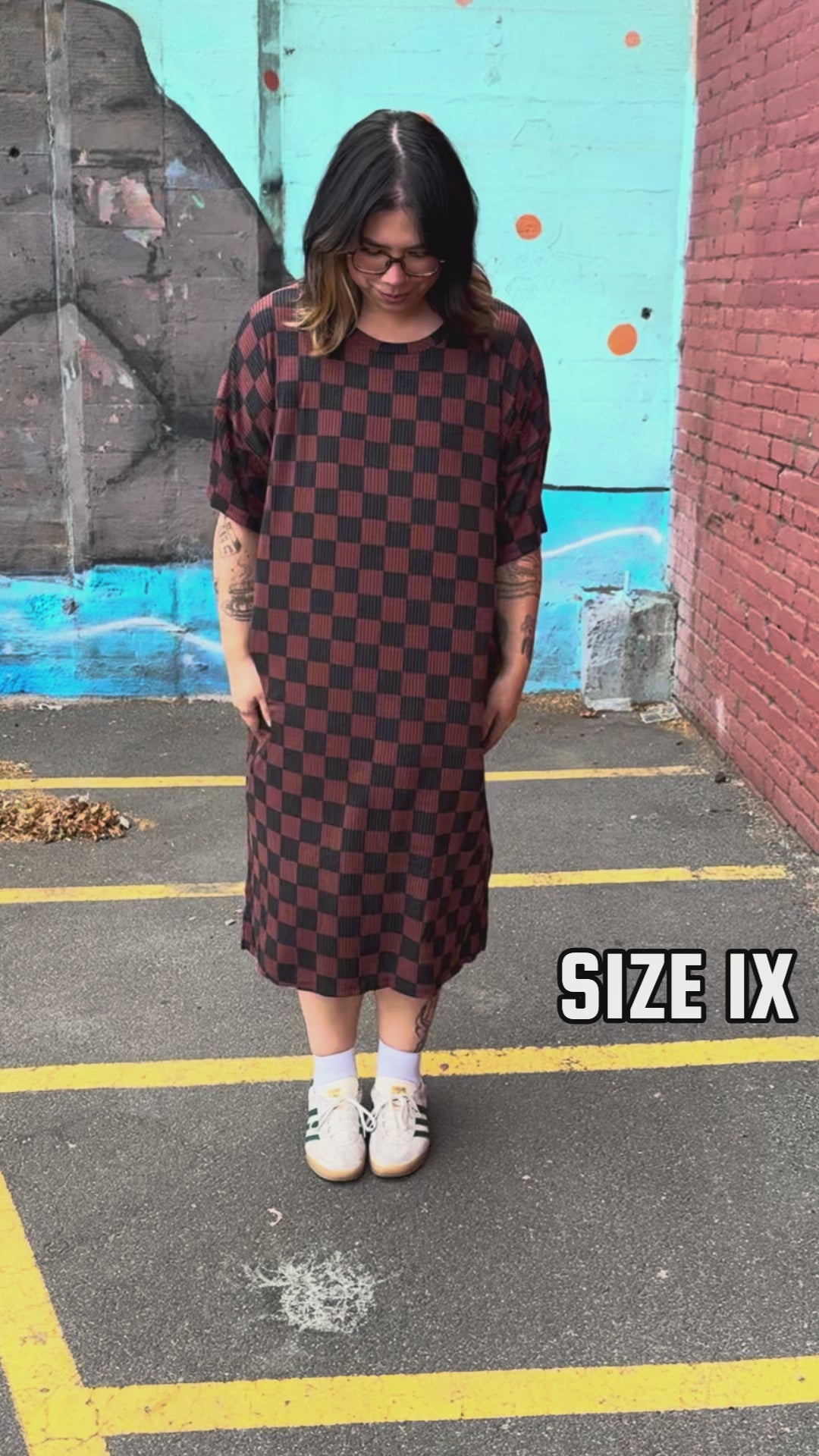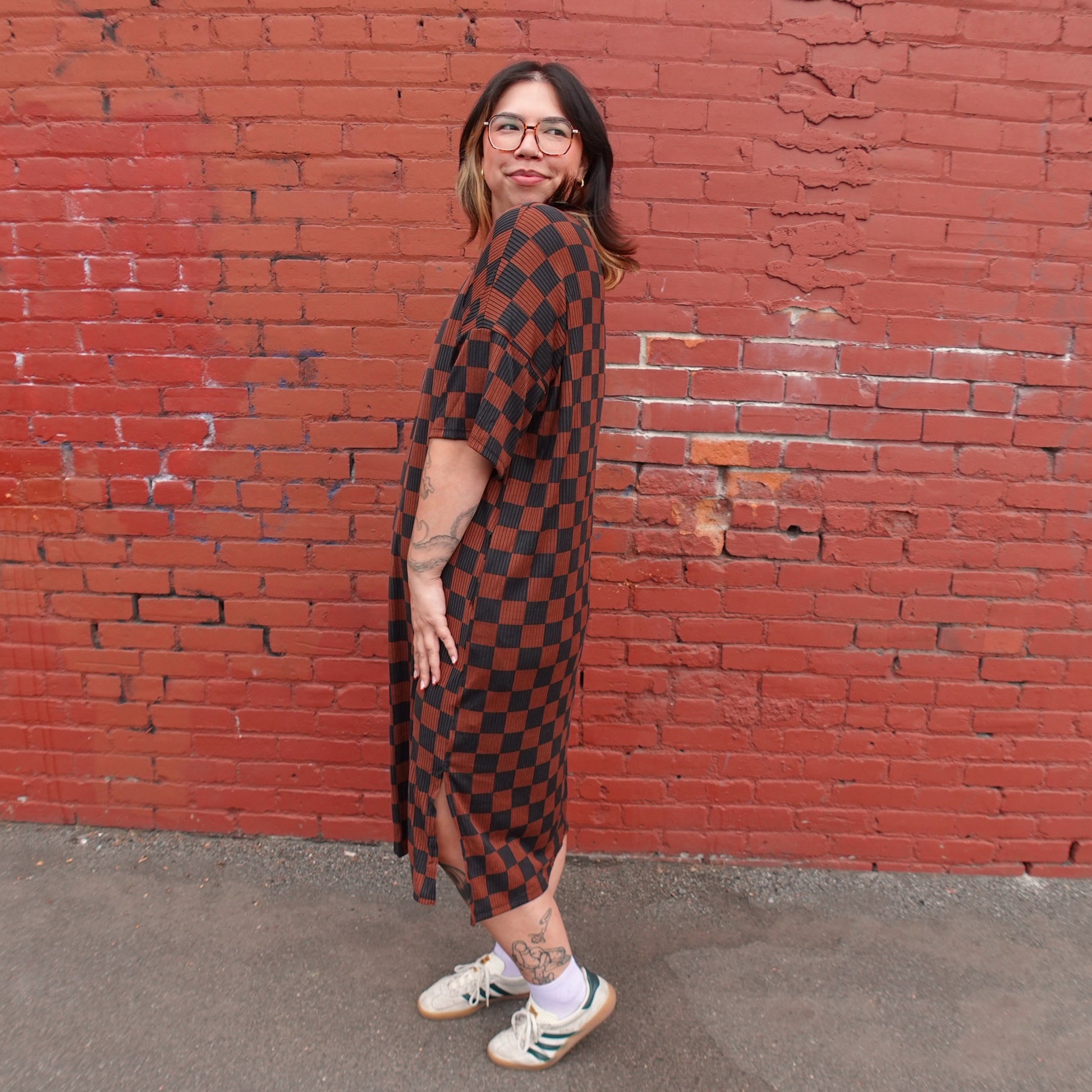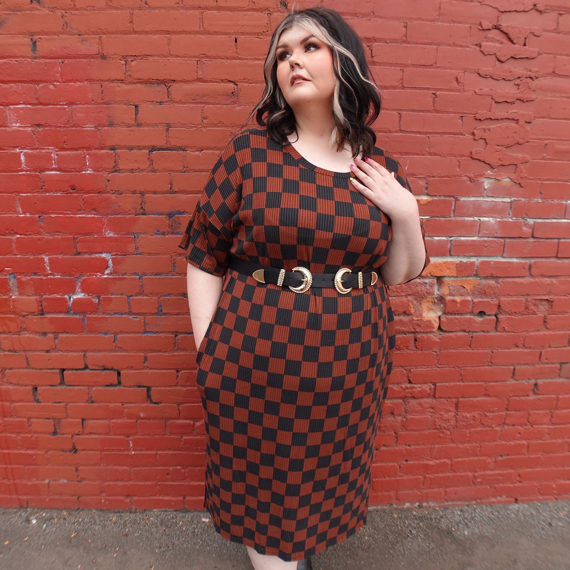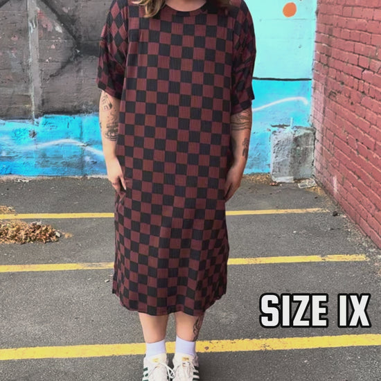 CHECKERED PRINT BROWN RIBBED MIDI DRESS