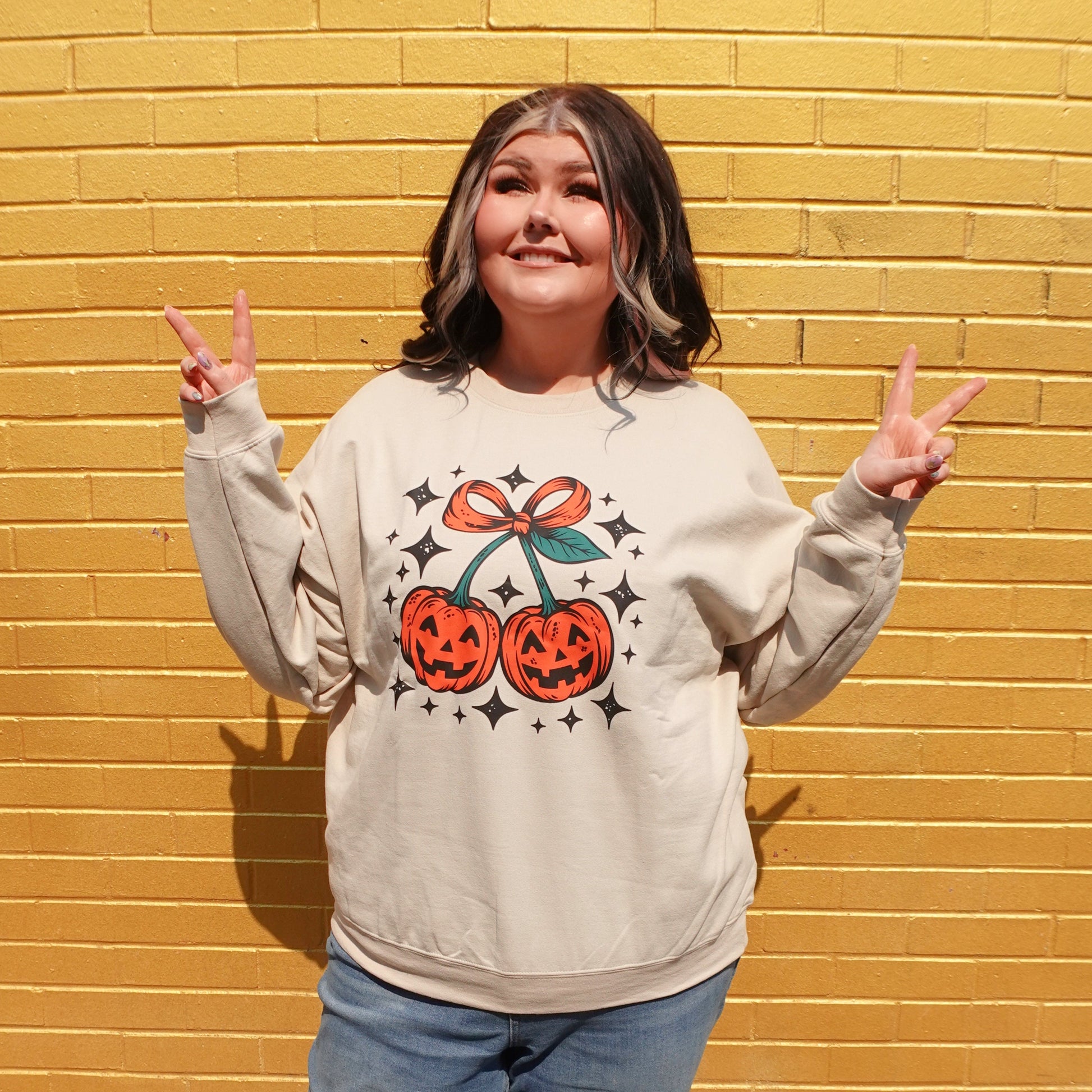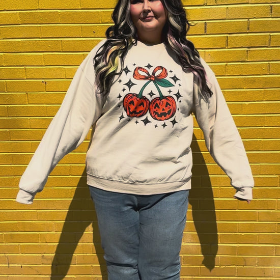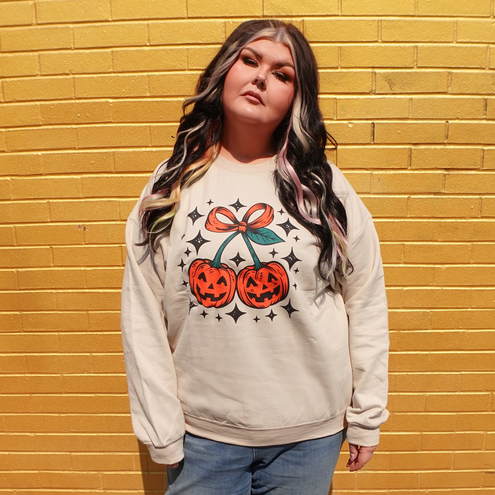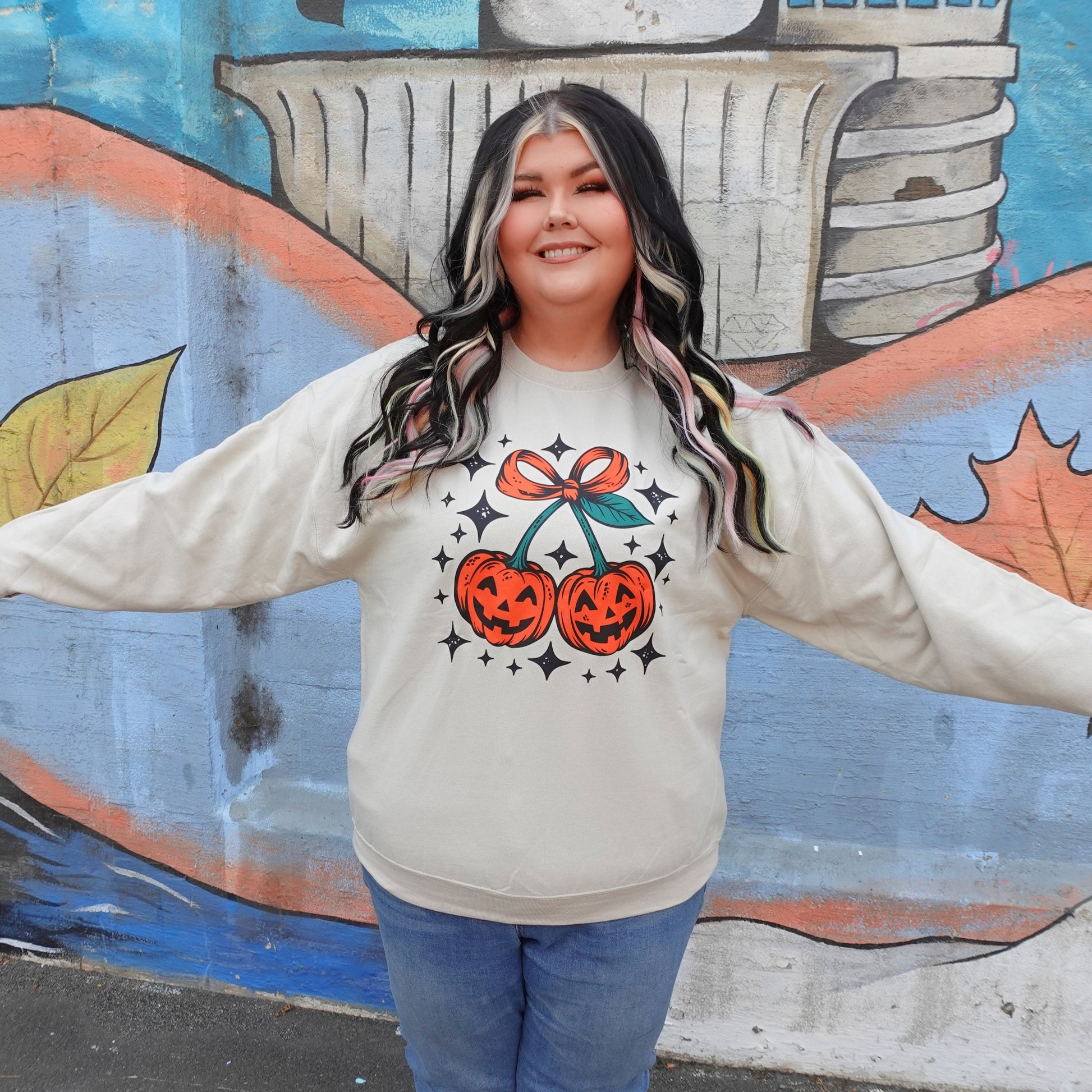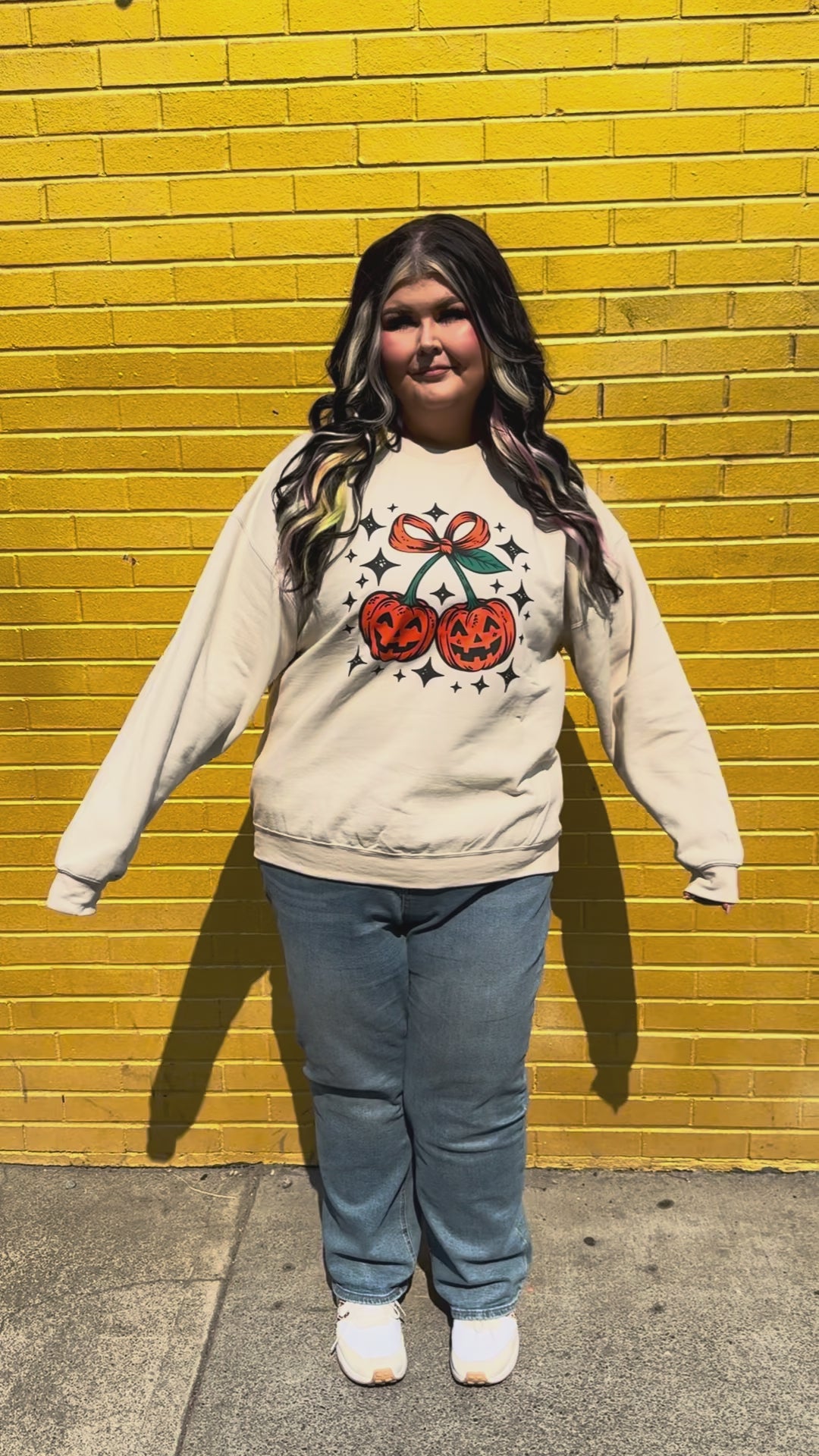 Super soft sweatshirt featuring a set of pumpkin cherries! Perfect for fall and halloween.