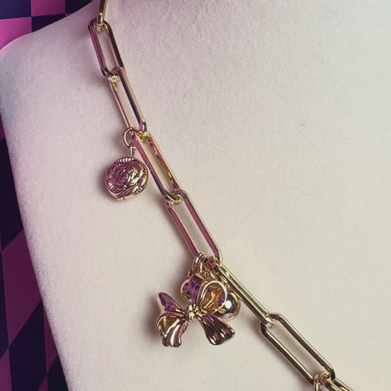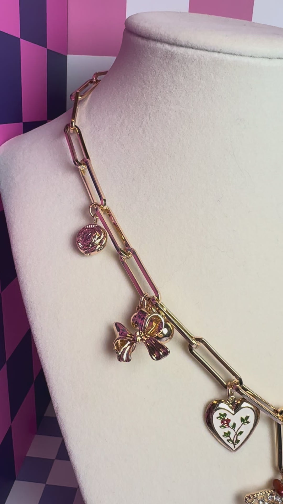 Chunky charm necklace featuring bows, hearts, shells and more!